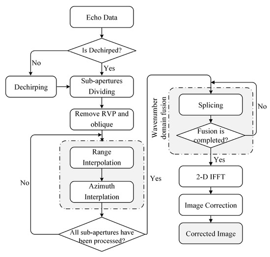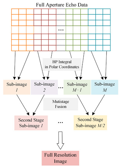 At this point, the data in polar format are converted to the Cartesian format by range interpolation and azimuth interpolation, respectively. Then, since there is no need to output sub-images, the multistage fusion is performed in the wavenumber domain (shown in Figure 4).
