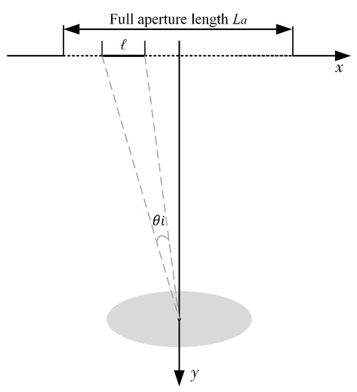 It should be noted that when there is an angle between the flight trajectories of different frames (see Figure 1a), the proposed algorithm reconstructs the image in a Cartesian coordinate centered on the full aperture, which results in a corresponding angular rotation of the full-resolution image. The rotation is shown in (28).