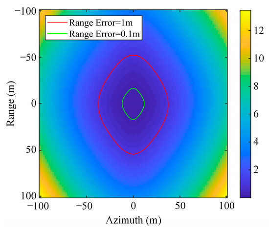Figure 5 shows the range error in the whole scene, in which the solid red line is the contour with a range error of 1 m, and the solid green line is the contour with a distance error of 0.1 m. It is easy to find that the closer the point target is to the center, the smaller the range error is, and vice versa. For example, the range error of the point at (50, 50) is larger than 1 m, which is almost equivalent to ten resolution units (resolution of 0.12 m). The ViSAR system usually requires the target to be positioned at the actual location in the image, so geometric distortion correction [40] of the image is essential.