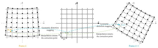 As can be seen from (26) and (28), the corresponding offset position or in the full-resolution image can be obtained according to the real position coordinates of the ground point target. Furthermore, the mapping relationship between them is known so that the correction can be realized by image domain resampling. Firstly, the correction area is selected, and the correction grid is divided, as shown in Figure 6. The correction points are evenly distributed in the coordinate system, and the horizontal and vertical intervals of adjacent correction points are , , respectively. For each correction point , its coordinates or in the full-resolution image are calculated, and then the correction point is returned from this coordinate in the full-resolution image by bilinear interpolation so that the correction of a single correction pixel is achieved. Then, the above process is repeated for all pixels of the full-resolution image. While realizing geometric distortion correction, the images are rotated into the same ground coordinate system.