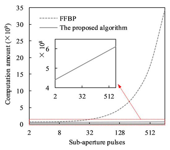 Thus, the number of complex multiplication operations required for each sub-aperture processing at the initial stage is . Therefore, the number of complex multiplication operations dealing with sub-apertures data is , i.e., .