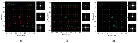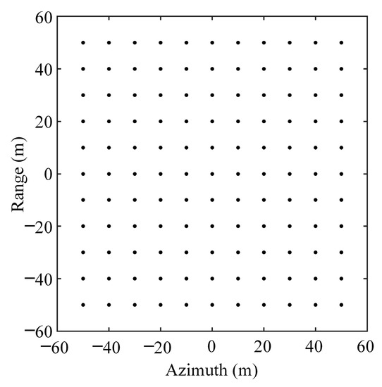 The simulation experiments were conducted in this paper to verify the proposed algorithm’s effectiveness and superiority. The main radar system parameters for the simulation experiment are shown in Table 1, which were used to simulate the echo data. There are 11 × 11 point targets evenly distributed in the scene (see Figure 9). The final imaging grid’s pixel points are 2048 × 2048 (Range × Azimuth). The theoretical value of 2D resolution is about 0.12 m × 0.12 m (Range × Azimuth). Here, the whole synthetic aperture is divided into eight sub-apertures, and each sub-aperture contains 256 pulses. Both algorithms adopt two as the radix for fusion in this simulation experiment.