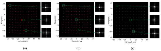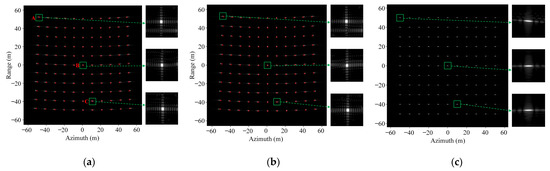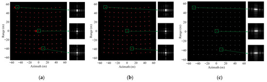Imaging results of point targets with : (a,b) Images before and after correction of the proposed algorithm; (c) Image of FFBP.