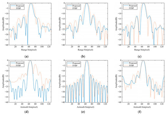Selecting representative points A, B, and C to analyze, and the 2D profiles of these points are, respectively, given in Figure 14. It is not difficult to see that the sidelobes of the 2D profiles in this proposed algorithm are some lower. The results of IRW, PSLR, and ISLR are shown in Table 3. The PSLR and ISLR of the proposed algorithm are lower than those of the FFBP, indicating that the image obtained by the proposed algorithm is better focused. Since there are assumptions in the proposed algorithm, the azimuth resolution of the algorithm is slightly lower than that of FFBP. However, it is still close to the theoretical value (0.12 m), so this situation is acceptable. Here, the image has full resolutions in azimuth and range. In summary, FFBP imaging accuracy has a certain loss, and more accurate interpolation methods or higher interpolation multipliers are needed to improve imaging accuracy, but this will inevitably increase the complexity of FFBP operations. In contrast, the proposed algorithm has higher imaging accuracy than FFBP, thus confirming the advantages of this algorithm.