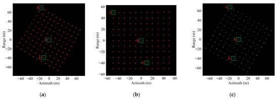The system parameters, shown in Table 1, were also used in the surface target simulation. Then, the radar echo data in the linear spotlight mode were generated [49,50,51]. Figure 17a,b show the imaging results with for the proposed algorithm. It can be seen from the image before correction that LPE causes the image to be distorted into a fan-shaped image. Compared with Figure 17a, Figure 17b shows that the geometric distortion has been effectively corrected. Additionally, the imaging result of FFBP is shown in Figure 17c for comparison.
