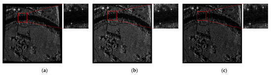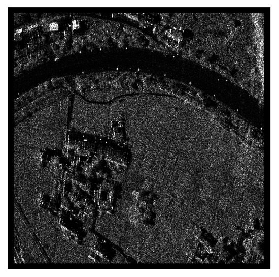 The surface target simulation was also performed to verify the proposed algorithm’s effectiveness. The input image of the simulation experiment, shown in Figure 16, is a SAR image of the stationary ground scene, which was acquired in Mianyang City, Sichuan Province, China, on June 2011 by the X-band airborne dual-antenna SAR system, developed by the Institute of Electronics, Chinese Academy of Sciences [48].