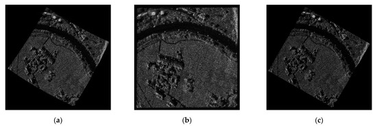 In addition, this section considers the angle between the flight trajectories of different frames, and the imaging results are shown in Figure 18. It is not difficult to see from Figure 18a that geometric distortion and corresponding rotation occur in the full-resolution image. After correction, as shown in Figure 18b, the image is established in the ground coordinate system with the scene’s center as the origin. Both the geometric distortion and the rotation are corrected effectively. However, FFBP does not consider the correction of image rotation (see Figure 18c). This further confirms that the proposed algorithm still applies to the non-ideal linear trajectory.