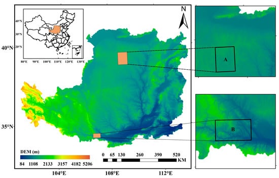 Location and digital elevation model (DEM) of the Loess Plateau and two sub-regions (A,B).
