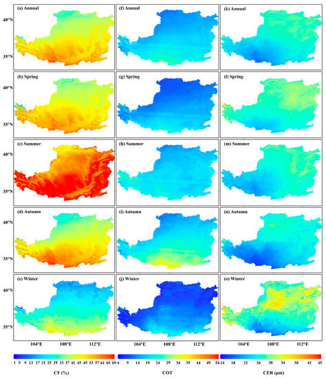 We calculated the annual and seasonal means of CF, COT and CER in space, and the results are shown in Figure 2. The spatial mean of the annual CF was 46.59%. Based on Figure 2a–e, we could see that the CF shows a similar spatial pattern: there were higher CF values in the southern Loess Plateau, and there were comparatively lower CF values in the northern Loess Plateau for all time scales. Moreover, different patterns could also be observed between the four seasons. The highest spatial mean CF value was observed in summer (63.47%), and the lowest value was observed in winter (28.00%). The spatial distribution of CF in summer showed that areas with high values were mountain ranges: Lvliang mountain and Taihang mountain over the eastern Loess Plateau and Qilian mountain over the western Loess Plateau, which indicates that topographic relief contributes to cloud generation over the Loess Plateau.