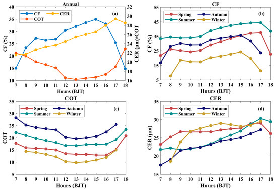 The diurnal variations in CF, COT and CER in the Loess Plateau. (a) Annual mean CF, COT and CER. (b) Seasonal mean CF. (c) Seasonal mean COT. (d) Seasonal mean CER.