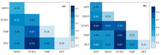 The cloud optical thickness and cloud effective radius data are from the Japan Aerospace Exploration Agency (JAXA). They are available at https://www.eorc.jaxa.jp/ptree/, accessed on 19 June 2022, while the cloud phase data is available at http://www.cloudsat.cira.colostate.edu/, accessed on 16 November 2022. The total column water vapor data can be obtained from https://cds.climate.copernicus.eu/, accessed on 9 January 2023. The aerosol optical thickness data is available at https://disc.gsfc.nasa.gov/, accessed on 6 January 2023. The NDVI data is available at https://ladsweb.modaps.eosdis.nasa.gov/, accessed on 27 November 2022. The temperature and potential evapotranspiration data are from National Tibetan Plateau Data Center. They are available at http://data.tpdc.ac.cn/, accessed on 26 November 2022.