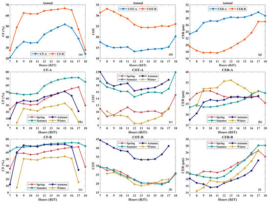 The diurnal variations in CF, COT, and CER in the Loess Plateau in the two subregions. (a–c) Annual and seasonal mean of CF in regions A and B. (d–f) Annual and seasonal mean of COT in regions A and B. (g–i) Annual and seasonal mean of CER in regions A and B.