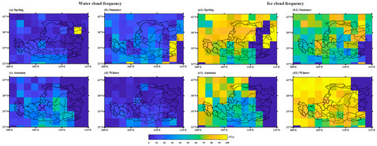 The pattern of CER contrasted with that of CF and COT. The CER values were larger in the northern Loess Plateau and relatively small in the southern Loess Plateau (Figure 2k). The CER was mainly influenced by aerosols, water vapor and thermal stability [54]. From Figure 5p,a, we can find that the total column water vapor and temperature are relatively small in the northern Loess Plateau. Based on Figure 7g, the CER value in region A was greater than in region B in the daytime. Region A is a desert area, and the total column water vapor, as well as the temperature, was relatively low. High values of CER in region A were mainly observed in spring and winter (Figure 7h). We also calculated ice cloud and water cloud frequency over the Loess Plateau based on CloudSat data in 2015 (see Figure 8). From Figure 8, there was a higher frequency of ice clouds over the northern Loess Plateau than over the southern area. Ice clouds also occurred more often in spring and winter, especially in the northern part of the Loess Plateau. This could have been associated with the colder temperature (Figure 5b,e) in spring and winter and the higher nucleation rate [55,56]. In addition, more dust and pollutants produced by human activities are present in the air in spring and winter because of sandstorms in spring and the use of heating in winter. They combine with water vapor and form large and dense cloud particles more easily. Over region B, in contrast, the CER values were larger in spring and summer (Figure 7i), which was more likely related to the sufficient water vapor and high aerosol optical thickness in spring and summer in region B [56]. However, Zhao et al. [57], Qiu et al. [58] and Jung et al. [59] found that CER is closely associated with the aerosol type, aerosol amount, cloud type, and water vapor, and their relationship is complicated. For example, aerosols as cloud condensation nuclei affect the CER value [49]. Moreover, the influence of aerosols on CER is also related to the environment [60]. Gao [48] found that the water cloud effective radius increased with increasing aerosol optical thickness, while the ice cloud effective radius was negatively correlated with aerosol optical thickness in the Loess Plateau. Under different cloud water content levels, CER showed different relationships with aerosol optical thickness [61]. Thus, the relationship between these influence factors and CER needs to be investigated further. Therefore, this analysis provides limited insight into the influence of different parameters on cloud parameters; it cannot be used to demonstrate a strong causal relationship between them.