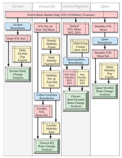 In Za’atari (Figure 1, far left), we calculated the SoL using the UNHCR’s Za’atari boundaries and compared daily NTL changes against Za’atari Pop counts. In the Oaxaca Earthquake (EQ) case study (middle left), we calculated the mean NTL of 5 day periods for the pre- and post-EQ days selected; we then used the National Institute of Statistics and Geography (INEGI) urban localities geographic boundaries to find the SoL and the sum of mobile phone location points for pre- and post-EQ, and compared changes of both sums for each locality. In the Oaxaca migration case study (middle right), we found the annual mean NTL for 2012 and 2015 by averaging daily observations, used the INEGI municipality boundaries to find the SoL of each year, and then compared changes between the 2 years in NTL against changes in Pop for each municipality. In Qatar (far right), we calculated the monthly NTL average using daily observations, used Qatar’s administrative boundaries to calculate the country’s monthly mean SoL, and then compared the monthly changes in NTL to monthly Pop counts for the country.