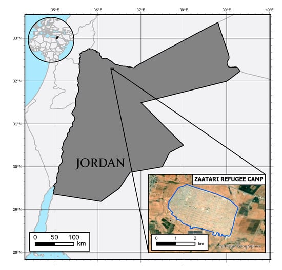 - Beals, G. One Year on: Jordan’s Za’atari Refugee Camp Mushrooms into Major Urban Centre. UNHCR: The UN Refugee Agency. 2013. Available online: https://www.unhcr.org/news/latest/2013/7/51f698ee6/year-jordans-zaatari-refugee-camp-mushrooms-major-urban-centre.html (accessed on 22 April 2021).