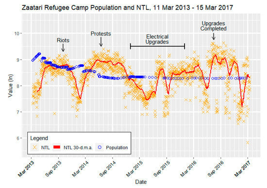 A review of the mandatory quality flags that accompanied the NTL data found that all of the pixels for all of the days observed were classified as having “good quality” observations. Thus, why do we see oscillation in NTL while Pop counts remain constant? News articles and UNHCR reports identified events on the ground, i.e., upgrades to the electrical system, that could have caused the de-electrification of the camp and resulted in the variation of NTL observed. Events identified are annotated in Figure 3 [46,47,48]. These sociopolitical events correspond to patterns seen in the NTL and are further discussed in the next section.