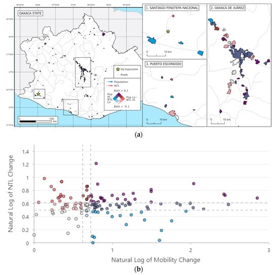 Changes in mobile phone check-ins and NTL for Oaxaca’s urban localities post-earthquake 16 February 2018. Oaxaca’s urban localities were classified using a bivariate color symbology dependent on the change in both mobility and NTL, where a ratio change C < −0.1 or C > 0.1 was considered significant. The color blue represents Pop and Red represents NTL; darker purple represents locations where C in both Pop and NTL are positively significant, and light gray represent areas where C in both are negatively significant. (a) Map of Oaxaca showing the EQ hypocenter, roads, and the selected urban localities with insets showing locations of interest (sources: NASA, INEGI, and CIESIN); (b) scatter plot comparing the respective values of mobility and NTL for each urban locality with ln transformation applied for visual purposes. The dashed lines delineate the bivariate classification scheme of the data points (source: NASA). Mobile phone data were provided through a nondisclosure agreement.