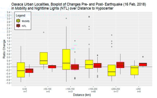 Changes in ratio for mobile phone mobility and NTL after the 16 February 2018 earthquake (EQ) were calculated for selected urban localities of Oaxaca. Urban localities were classified into 50 km increments away from the EQ hypocenter, which was used to generate the boxplots. Twelve mobility outliers were omitted from this figure for easier viewing (seven in the >150−200 bin, and one in the >250 bin). Source: NASA. Mobile phone data were provided through a nondisclosure agreement.