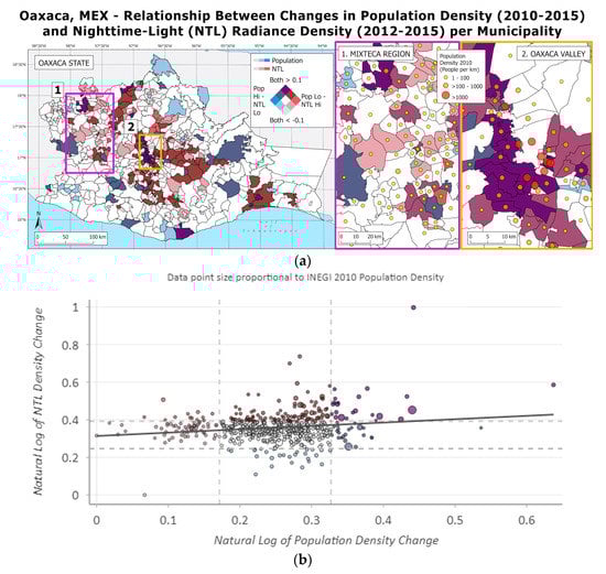 Changes in NTL during 2012–2015 and changes in Pop densities during 2010–2015 in Oacaca’s municipalities were compared using a multivariate symbology, where a ratio change C < −0.1 or C > 0.1 was considered significant. The color blue represents Pop density and Red represents NTL; darker purple represents locations where C in both Pop density and NTL are positively significant, and light gray represents areas where C in both are negatively significant. (a) Map of Oaxaca showing its municipalities with insets showing Pop densities of municipalities in 2010 ((a1) cold spot region where Pop density decreased, (a2) hotspot region where Pop density increased); (b) scatterplot comparing changes in NTL over changes in Pop densities with ln transformation for easier viewing. The dashed lines delineate the classification scheme mentioned.