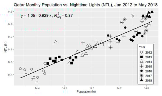Scatterplot comparing Qatar’s monthly population counts and sums of NTL with ln transformation from January 2012 to May 2018. Sources: NASA and PSA.