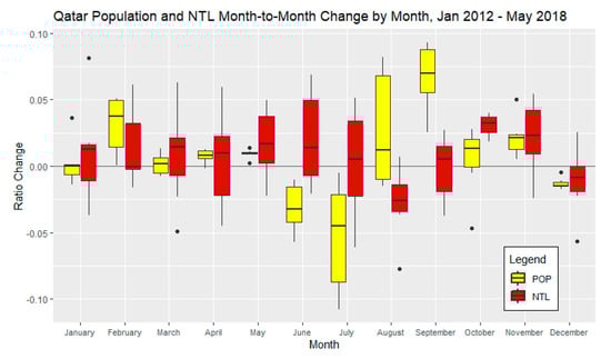 Boxplots of month-to-month change in Qatar’s population and NTL by month of the year. Population counts and summed monthly mean NTL values were divided by the previous month’s values to determine change. Sources: NASA and PSA.