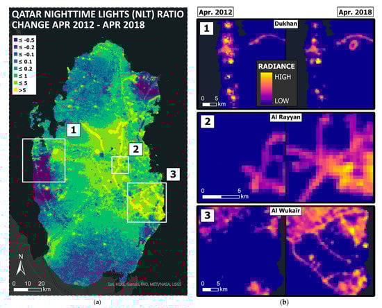Monthly means of NTL were calculated using daily NTL data for April 2012 and April 2018, respectively. (a) Ratio changes (Equation (1)) of NTL for Qatar were calculated for each cell using monthly NTL means for April 2012 as the initial value and April 2018 as the final value. (b) Values of NTL radiance are compared side-by-side for April 2012 (left) and April 2018 (right); insets show areas of interest: (b1) Dukhan region where hydrocarbon production occurs and a doughnut-shaped camel racetrack was constructed; (b2) Al Rayyan area showing development of highways and a football stadium ahead of the FIFA World Cup Qatar 2022; (b3) a major trade port in the Al Wukair region, along with roads connecting it to Doha, is under construction. Source: NASA.
