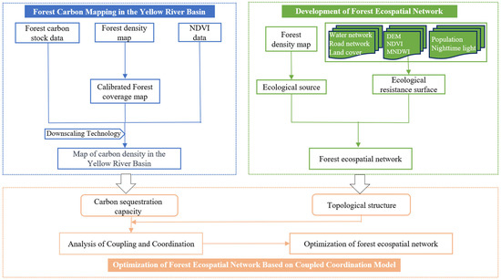 Therefore, this paper proposes a novel forest ecospatial network (ForEcoNet) based on complex network theory to achieve the increasing of forest carbon stock. Firstly, in our study, we calibrated the forest density distribution map of the Yellow River Basin and then combined forest inventory data to achieve the spatial grid mapping of forest carbon density in each city. Secondly, the ForEcoNet of the Yellow River Basin was extracted and evaluated using topological indicators. Finally, quantitative measures to optimize ForEcoNet for carbon stocking in the study area were proposed based on a coupling coordination analysis. This study’s results are important for monitoring forest structure and carbon storage distribution, and can provide scientific reference for strengthening the scientific management of forest ecosystems and formulating specific measures for carbon sequestration in the region.