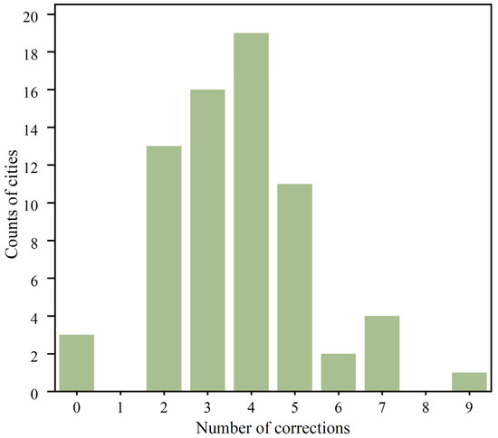 Within the specified number of repetitions, all cities were successfully calibrated (Figure 3). Three cities did not require correction for forest coverage as the remote sensing data matched the actual coverage of the forest inventory. Most cities (85%) were calibrated within 2–5 iterations, while the maximum number of calibration iterations was 9 for Xi’an, Shaanxi Province. At the urban scale, the forest coverages in the forest inventory and remote sensing data statistics were different, but after correction, they were consistent. Figure 4a shows the degree of correction. Most of the remote sensing map showed higher forest coverage than the actual coverage in the south-central part of the Yellow River Basin, resulting in a negative correction. In contrast, the forest coverage in the remote sensing data in the lower reaches was smaller than the actual coverage, leading to a positive correction.