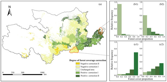 Degrees of forest coverage correction (a) and histogram of the frequency distribution of forest cover proportion before (b1,c1) and after (b2,c2) calibration in Binzhou (b1,b2) and Shangluo (c1,c2). The negative or positive correction is based on the differences between each pixel’s forest coverage before and after correction. If the difference is larger than zero, negative correction occurs, while positive correction means the difference is less than zero. Furthermore, I and II indicate the degree of correction; the larger this number is, the greater the difference in forest coverage rate before and after calibration becomes.