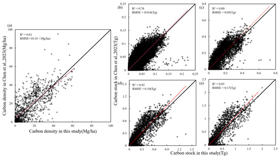 Scatter plots of the carbon density in Chen et al., 2023 (Y-axis) and carbon density in this study (X-axis) at sample point (a) and regional scale at 25 km2 (b), 100 km2 (c), 225 km2 (d) and 400 km2 (e). The black line represents the 1:1 line and the red line is the trend line.
