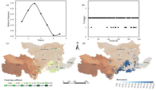 The forest ecological sources with a clustering coefficient of 0 accounted for 46.94% (46 sources), and these patches were not clustered with other sources. They were mainly distributed in the northern Sichuan Province, southwestern Shaanxi Province, eastern Qinghai Province, and northern Shanxi Province (Figure 8c). Five patches exhibited clustering properties, with a maximum clustering coefficient of 1 in the network. They were source 56 in Yuncheng, source 38 in Binzhou, source 14 and 21 in Wuwei, and source 15 in Haixi Mongolian Tibetan Autonomous Prefecture. The average clustering coefficient was 0.22, indicating that the overall connectivity of nodes in the ecological network was not very strong and that the stability of the network was poor.