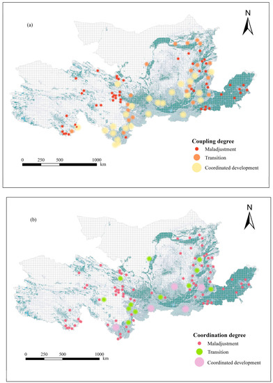 Spatial distribution of coupling degree (a) and coordination degree (b) of forest ecological sources.