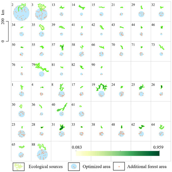 Based on the analysis of the coupling coordination between forest carbon sequestration capacity and topological structure in the Yellow River Basin, we proposed optimization methods for the ForEcoNet from two perspectives. The first method was to increase the carbon stock of sources based on their coupling degrees. For sources with low coupling degree values, we calculated the requirement in carbon stock and forest area that could move them out of their maladjustment. Based on the current average forest coverage of sources, we estimated the increasing area for each source. As shown in Figure 10, a total of 51 sources needed to increase their carbon sequestration capacity. The upper reaches required an additional forest area of 9772 km2, the middle reaches required 5146 km2, and the lower reaches required 7910 km2. The sources that required the most increase in forest area were source 3 and source 2 in Ordos, which required 1983 km2 and 1545 km2, respectively. The source with the third-highest requirement was source 88 in Puyang, which needed to increase its forest area by 1418 km2.
