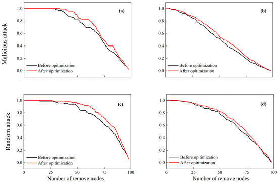 Node recovery robustness (a,c) and edge recovery robustness (b,d) of the network before and after optimization.
