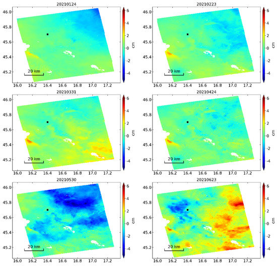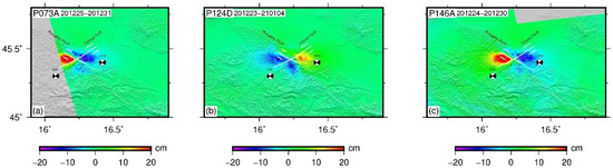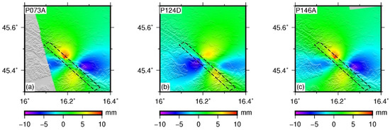 For strike-slip earthquakes with a magnitude close to the 2020 Petrinja earthquake (Mw 6.4), postseismic deformation is often observed within several days to months [24] after the mainshock. The first postseismic 6-day interferogram of this earthquake was constructed 7 days after the mainshock, with image pair 20201231–20210106 from ascending track P073A (Figure 7a). A sharp phase jump localized on the NW edge of the fault was observed in this earliest postseismic interferogram, the LOS displacement was ~2 cm in the first week after the mainshock. All the postseismic interferograms (Figure 7a–c) from the three different tracks showed localized uplift (in the black rectangle), suggesting minor horizontal deformation. The ascending track P146A presented the largest LOS displacement due its earlier acquisition time of master image and later acquisition time for secondary image. The similar magnitude of ascending track P073A and descending track P124D indicated almost the same deformation amount in the time period 20201231–20210106 and 20210104–20210110. This observation also demonstrates that most of the postseismic displacement in P146A occurred in the time period 20201230–20201231. Further, we processed the Sentinel-1 images acquired in the first 6 months after the event to evaluate the early postseismic deformation following the 2020 Petrinja earthquake. We utilized the Small BAseline Subset (SBAS) time-series method [25] implemented in the MintPy package [26] to construct the deformation time series. Two tracks of SAR data were used to construct the LOS deformation time series, including one ascending track P073A and one descending track P124D. The interferogram network of each track consists of 29 and 30 images, respectively. The temporal–spatial baselines are plotted in Figure 8. The deformation history with respect to the earliest acquisition is shown in Figure 9 and Figure 10, respectively. All the tracks demonstrated postseismic deformation in the northwestern edge of coseismic deformation region.