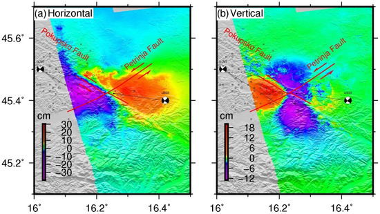 The 2020 Petrinja earthquake occurred at 11:19 on December 29 (UTC time) in the central part of Croatia, with an epicenter located roughly 3 km west-southwest of the town of Petrinja, 40 km southeast of Zagreb, the capital of the country. The focal mechanism and the distribution of aftershocks determined by the United States Geological Survey (USGS) show that the earthquake ruptured a NW-SE striking transcurrent fault with mainly left-lateral strike-slip. The USGS centroid moment tensor (CMT) solution shows a main nodal plane with a strike of 134° and high dip of 76° with predominantly left-lateral motion. It is the strongest earthquake to occur in Croatia since the advent of modern seismic instruments (USGS). This event destroyed about half of the town of Petrinja, where many buildings collapsed and resulted in at least seven deaths and more than 26 injuries [1,2]. There were two moderate-size foreshocks that occurred just one day before the mainshock. The first event struck at 05:28 UTC (Mw 4.8 GFZ), while the other Mw 4.4 event struck at 06:49 UTC [1]. The focal mechanism solutions of the earthquake (Table 1) from most of the seismic agencies suggest right-lateral strike-slip faulting, which is consistent with the regional tectonics [3]. As the largest earthquake instrumentally recorded in the region, coseismic and postseismic displacements of the Petrinja earthquake are critical to illuminate the local active tectonic structures and potential seismic risk.