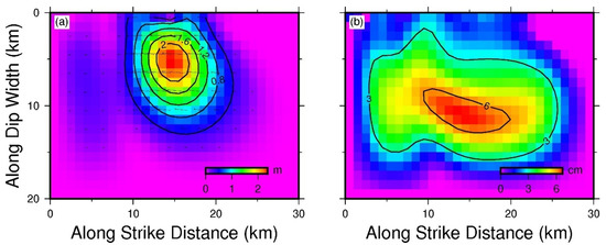 Three mechanisms can be used to explain postseismic deformation: viscoelastic relaxation, poroelastic rebound, and afterslip [27,28]. To examine the possibility of the poroelastic rebound as the driving mechanism, we used the Poisson’s ratio under different conditions (0.28 for undrained value and 0.25 for drained value) to calculate the simulated deformation, then do a subtraction between them [27]. The predicted LOS displacements related to poroelastic rebound for different tracks are shown in Figure 13. The deformation caused by poroelastic rebound shows a larger extent compared with the observations. In addition, the sign of LOS displacement calculated from poroelastic rebound is opposite to the observed LOS motion. The surface deformation due to viscoelastic relaxation at larger depth than coseismic slip usually has a larger spatial extent than coseismic surface deformation [28]. However, the observed postseismic deformation is limited in a localized area. Due to different predicted deformation pattern and sign, we suggested that the contributions of poroelastic rebound and viscoelastic relaxation are small. The afterslip was adopted to understand the mechanism responsible for the postseismic deformation mainly in the early days.