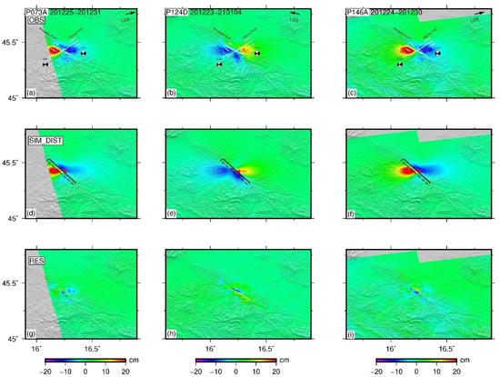 Observational (a–c), synthetic (d–f) and residual (g–i) interferograms of our preferred fault model.