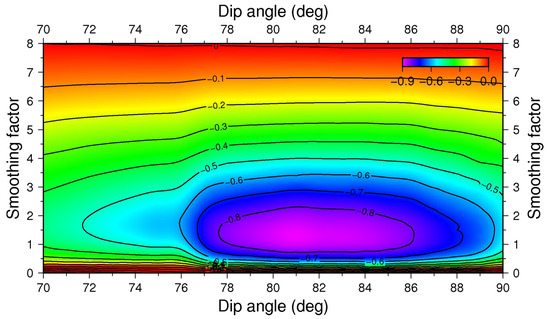 The optimal dip angle and smoothing factor derived from the grid search are 82° and 1.2, respectively (Figure 6).