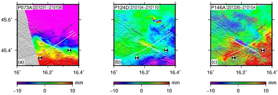 The coseismic interferograms of the Petrinja earthquake. (a) shows the image pair 20201225–20201231 (ascending orbit 73). (b): 20201223–20210104 (descending orbit 124). (c): 20201224–20201230 (ascending orbit 146). The white solid lines indicate the locations of two faults.