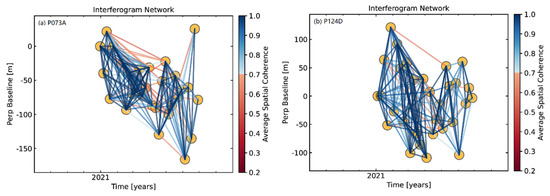 Baseline plots of selected interferograms from two Sentinel-1 tracks. Circles are selected SAR acquisitions: 29 for ascending track 73, and 30 for descending track 124.