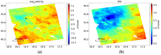 (a,b) Average velocity and its standard deviation of postseismic deformation in the descending track P124D. The black rectangle denotes the location of reference point.