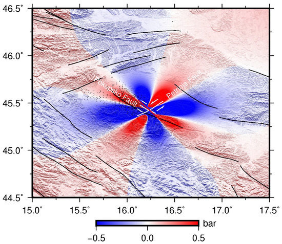 Coulomb failure stress change caused by the 2020 Mw 6.4 Petrinja earthquake. The black circles denote the location of relocated aftershocks obtained from EMSC (https://www.emsc-csem.org/, accessed on 15 May 2023).