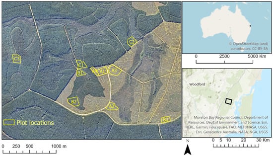 The study site locations were within the Hancock Queensland Plantations Pty Ltd. (HQP) Beerburrum Forest and located to the east of the Bruce Highway, approximately 55 km north of Brisbane (Figure 1). The plantation consisted of ‘Southern Pine’ species (Pinus caribaea and Pinus elliotti) and the 10 study sites selected ranged from new plantings to mature trees. HQP refers to individual plantation sites as ‘compartments’. The compartments chosen had a tree age range of 1–10 years. The compartment understory profiles comprised various combinations of grasses, mainly whisky grass (Andropogon virginicus), blady grass (Imperata cylindrica) and signal grass (Urochloa decumbens), sedges, shrubs, herbaceous species, bracken fern and dry remnant woody material. The area has an average annual precipitation of 1057 mm and an average temperature of 20.2 °C [].