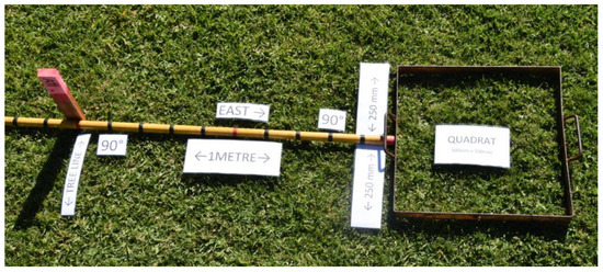 Three sampling locations were randomly selected within each compartment as follows: From a point 20 m from the compartment boundary, the first predetermined compass bearing selected from a list generated using ‘Random Lists’ (https://www.randomlists.com/random-direction, accessed on 15 May 2023) was followed for a tape-measured distance of 50 m to sampling point one. A labelled stake (Group ID, Compartment Number and Site Number) was placed at the closest point within the planting row and the GNSS position was noted on the Field Survey Data Sheet using the GDA94 Zone 56 UTM Coordinate System. A 0.5 × 0.5 m quadrat was positioned one metre east of the stake (Figure 2). The maximum and average vegetation heights, a vegetation class summary and % ground cover within the quadrat were recorded.