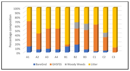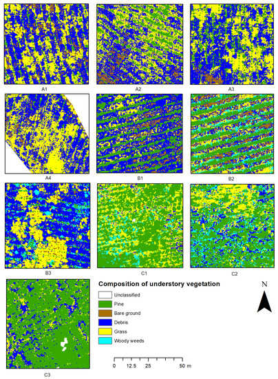 Understory vegetation classification and percentage composition of all compartments derived by classifying RGB orthomosaics. Panels for compartments (A1–A4,B1–B3,C1–C3) show composition of understory vegetation in each compartment.