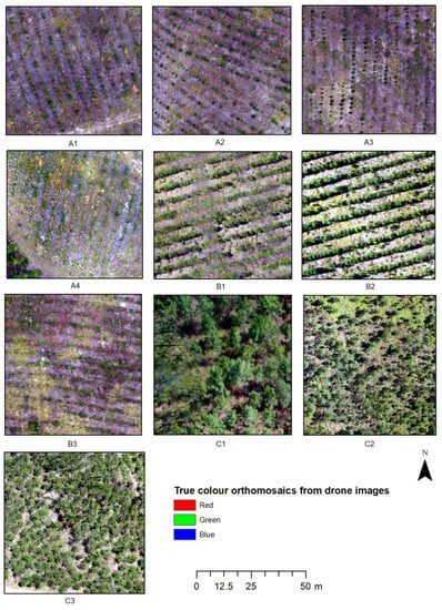 ‘RGB Composite’ orthomosaic from drone images for all compartments. Panels (A1–A4,B1–B3,C1–C3) shows orthomosaic of compartments selected for this study.