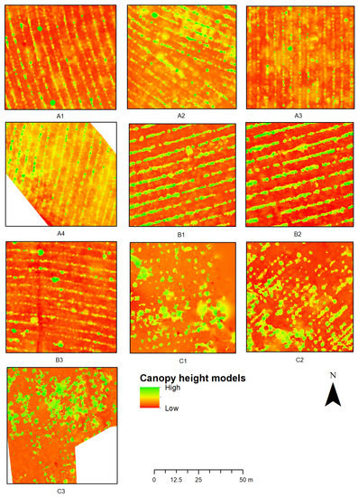 Canopy height models of all compartments were derived by subtracting the elevation model from the drone-derived surface model. The panels (A1–A4,B1–B3,C1–C3) show canopy height models for different compartments.
