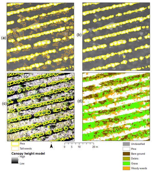 Application of MCWS on the canopy height model to identify pine trees and their subsequent removal to focus on understory vegetation, an example from plot B2. (a) Derivation of tall vegetation in the CHM; (b) identification of pine; (c) comparison of pines with the orthomosaic; (d) classified understory vegetation.