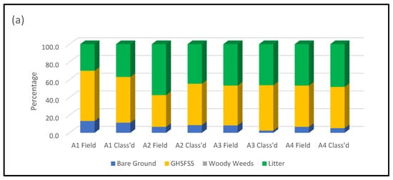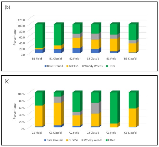 The classified vegetation modelling for orthomosaics A1–C3 is illustrated in Figure 13. The comparison of the compartment composition field data and classified models is presented in Table 3. The presence of woody weeds in B2–C2 and the increased canopy cover in the ‘C’ compartments are evident.